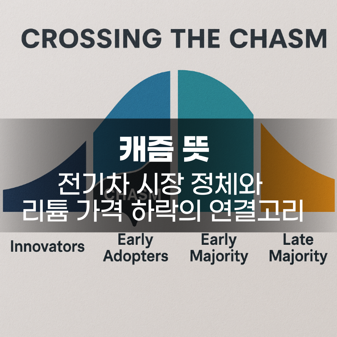 기술이 대중에게 퍼지기 전에 겪는 가장 큰 장애물, 바로 '캐즘(Chasm)'입니다. 전기차 시장이 현재 그 캐즘 앞에 멈춰 섰다는 분석이 많습니다. 동시에 리튬 가격도 폭락하고 있어 두 현상이 어떻게 연결되어 있는지 궁금해하시는 분들이 많습니다. 이 글에서는 캐즘의 정의와 함께 전기차 산업과 리튬 가격 하락 사이의 상관관계를 쉽게 설명해 드립니다.